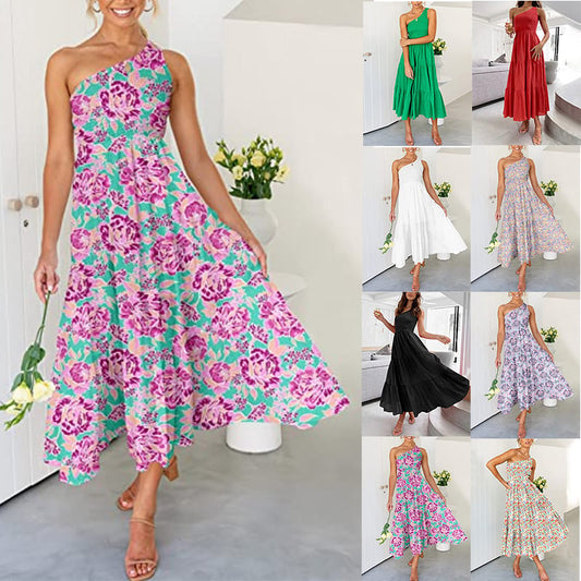 Women's 2023 Summer Bohemian One Shoulder Sleeveless Smocked Ruffle Tiered Beach Maxi Sun Dress