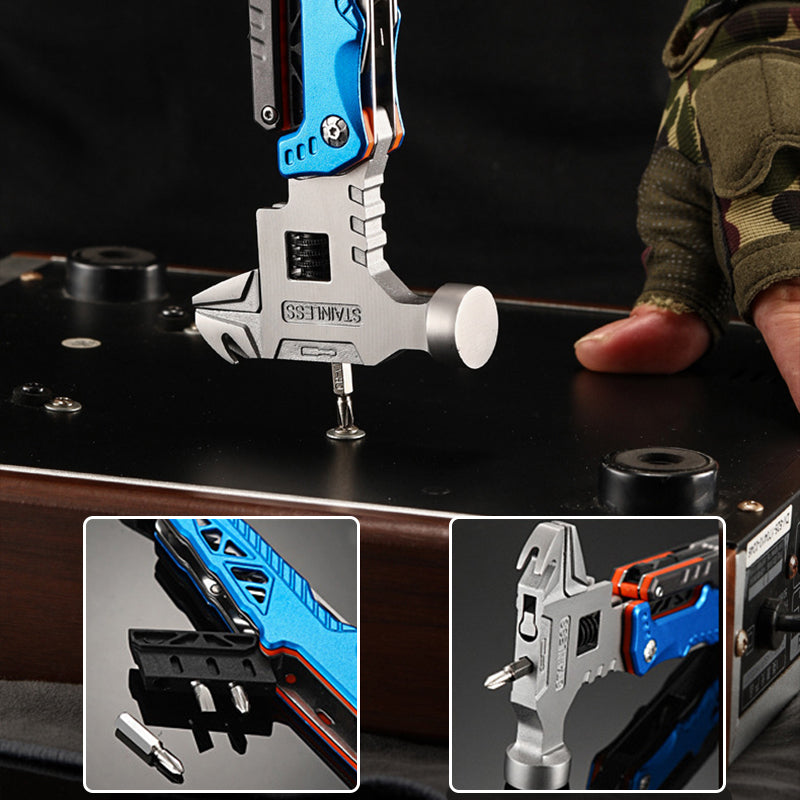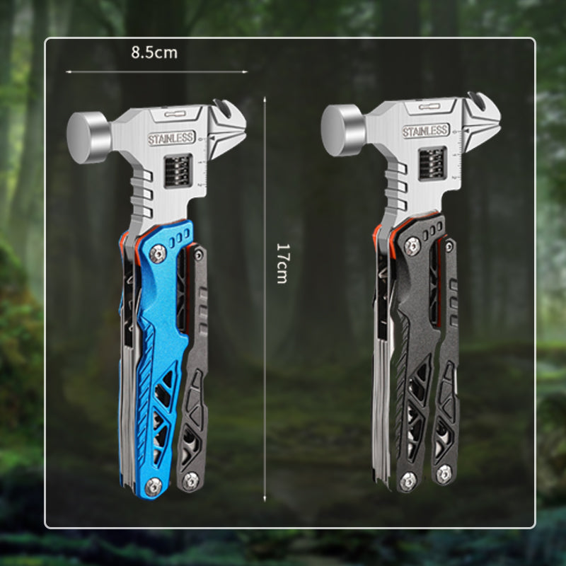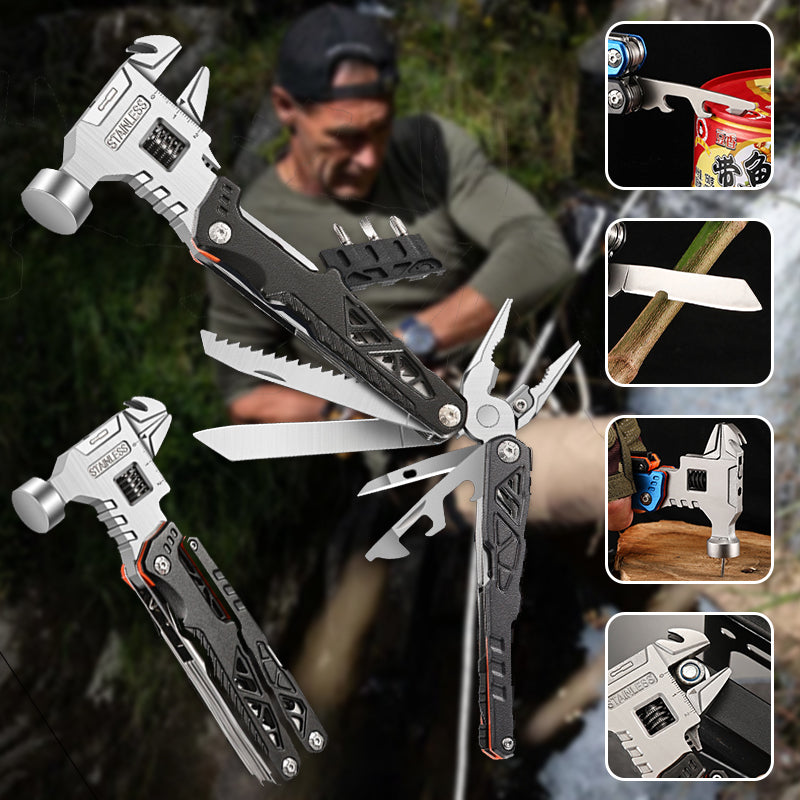 MULTI-FUNCTIONAL TOOL: This versatile tool includes an adjustable wrench, hammer, nail puller, screwdrivers, wire cutter, regular pliers, needle-nose pliers, flint rod, safety whistle, bottle opener, can opener, threader, knife, saw, and more—everything you need in one compact device.
