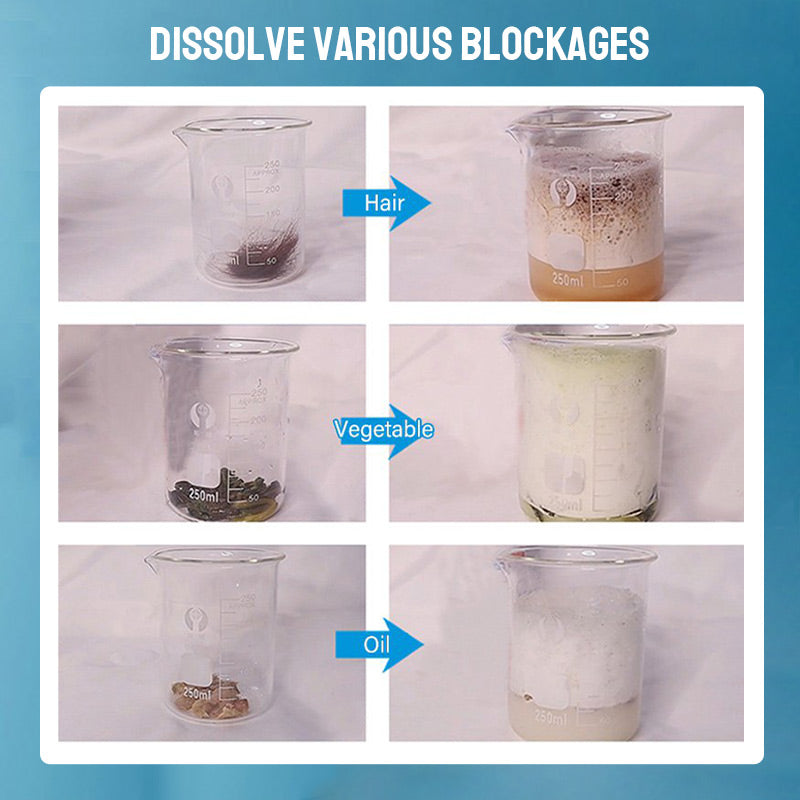 Powerful Function: It can quickly dissolve pipe blockages such as hair, paper, soap scum, vegetables, fruits, food residue, grease, and organic matter.